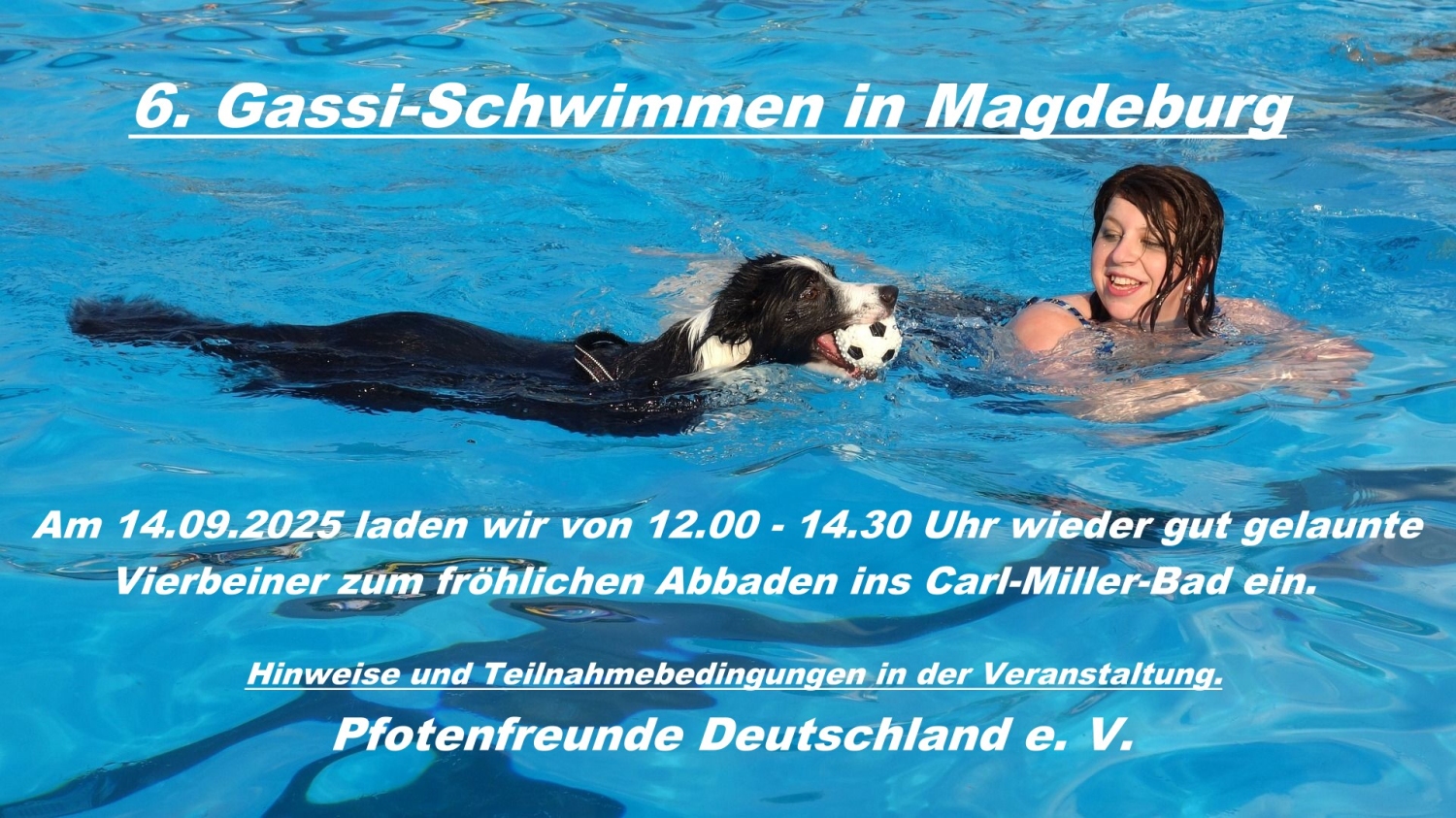Der Verein Pfotenfreunde Deutschland e.V. lädt am Sonntag, den 14. September, zum sechsten Gassi-Schwimmen für Vierbeiner ins Magdeburger Carl-Miller-Freibad ein.