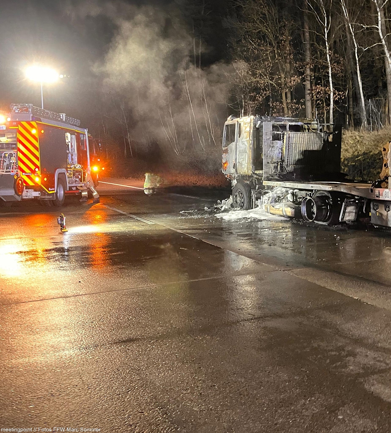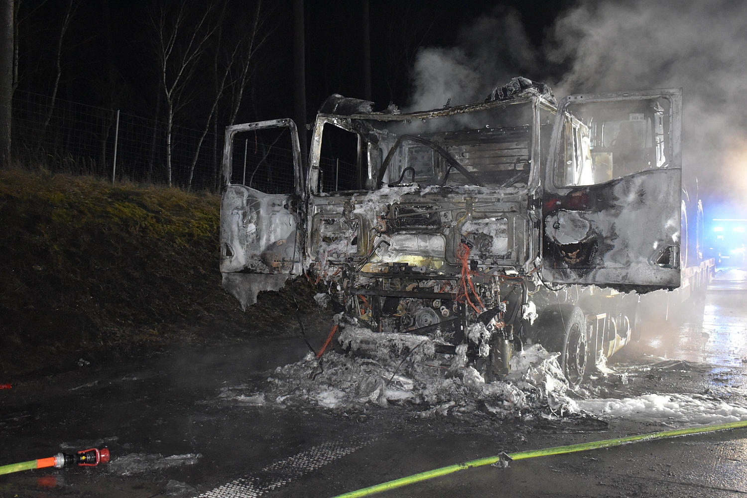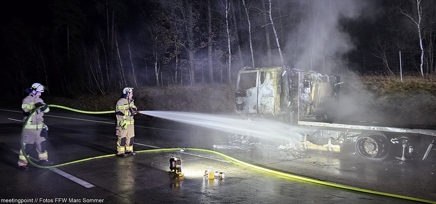 Der 59-jährige Lkw-Fahrer war gegen 02:00 Uhr auf der Autobahn unterwegs, als er plötzlich einen lauten Knall wahrnahm. Geistesgegenwärtig lenkte er sein Gespann auf den Standstreifen und verließ umgehend die Fahrerkabine. Bei einer ersten Kontrolle seines Fahrzeugs bemerkte er bereits, dass aus einem der Radkästen dichter Rauch aufstieg – ein geplatzter Reifen hatte offenbar den Brand ausgelöst. Nur kurze Zeit später stand die Zugmaschine in Vollbrand.