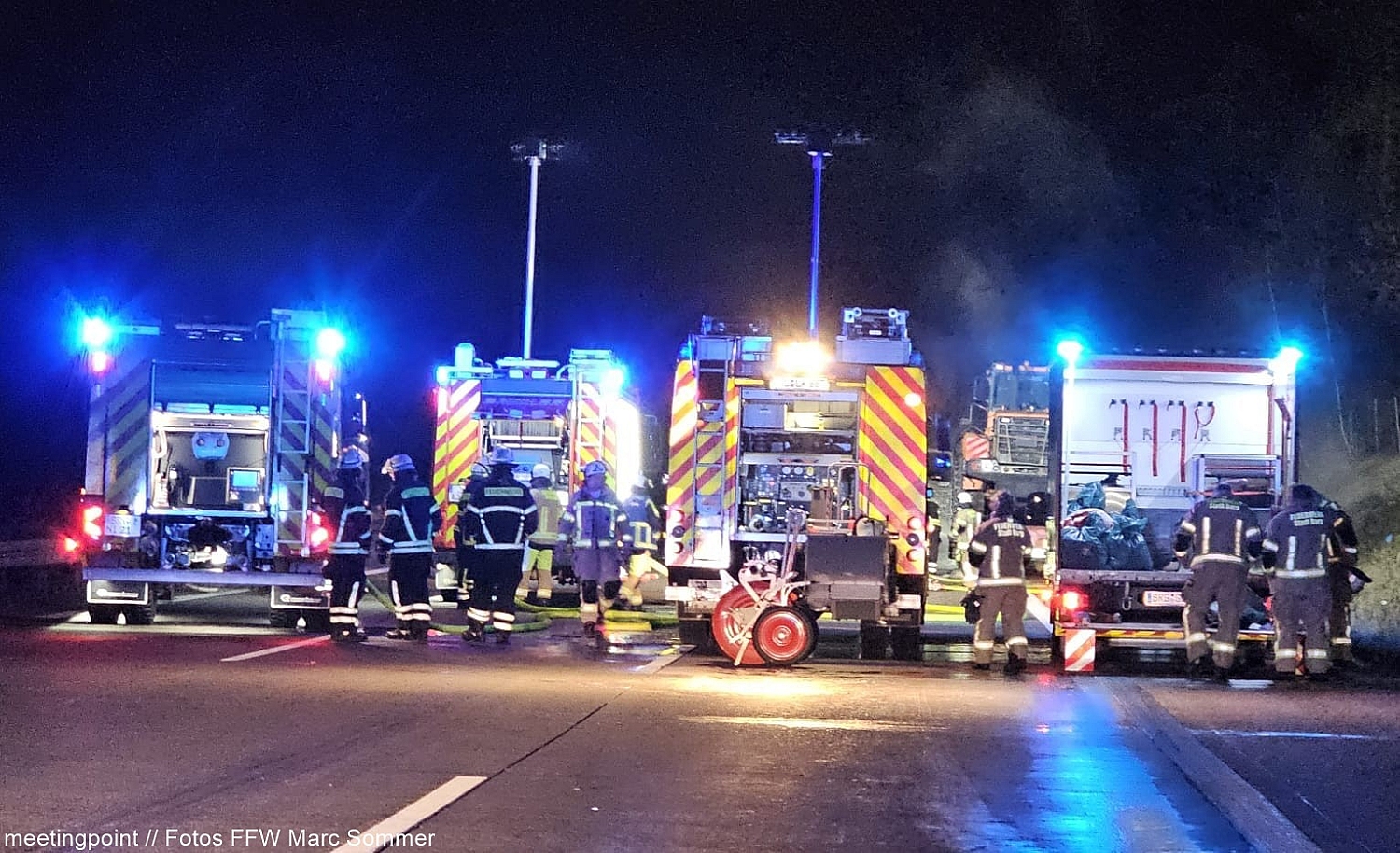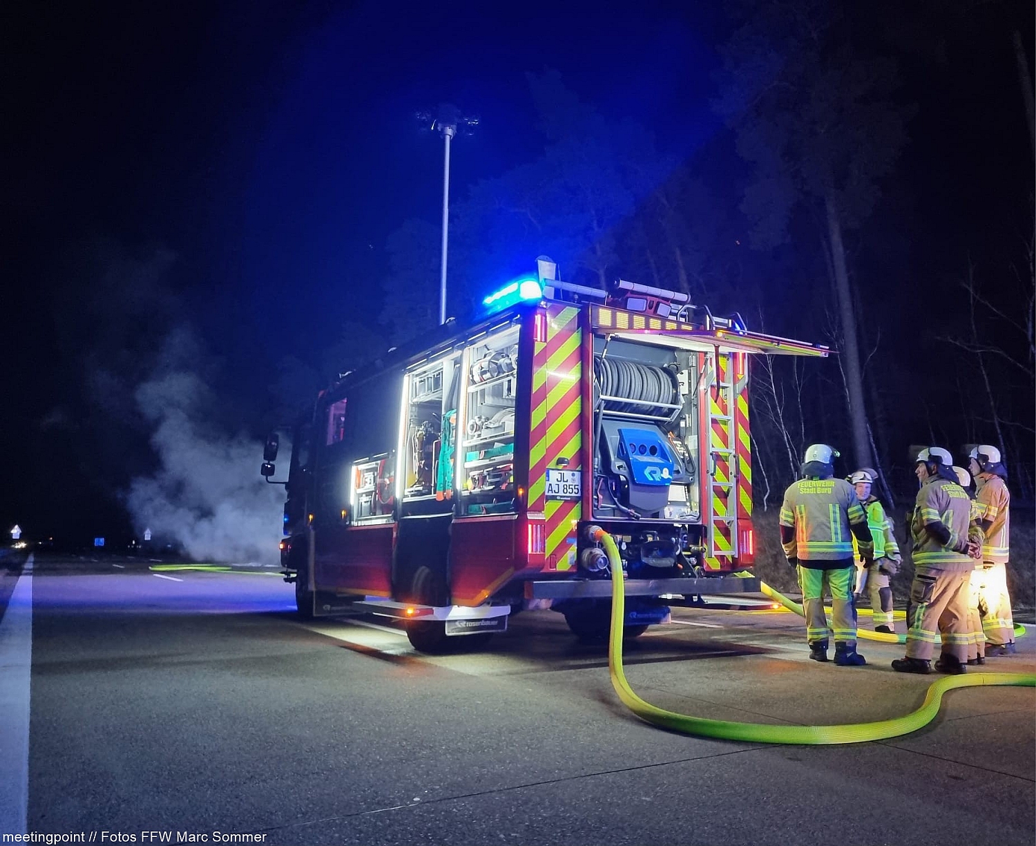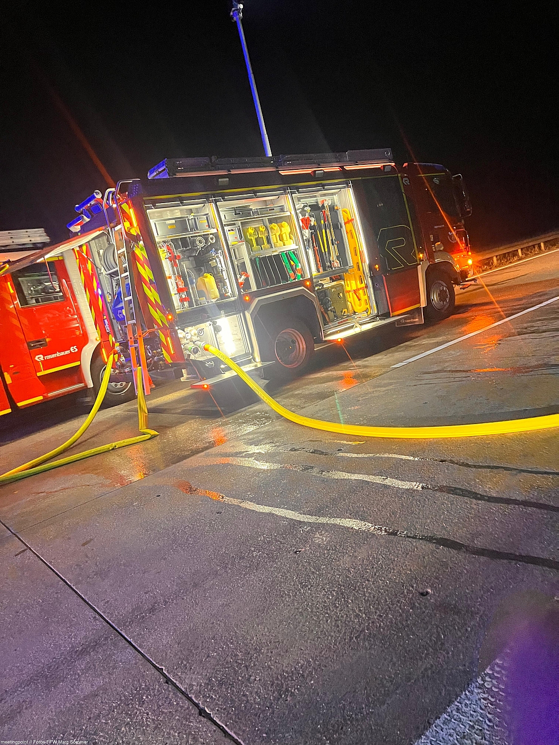 Der 59-jährige Lkw-Fahrer war gegen 02:00 Uhr auf der Autobahn unterwegs, als er plötzlich einen lauten Knall wahrnahm. Geistesgegenwärtig lenkte er sein Gespann auf den Standstreifen und verließ umgehend die Fahrerkabine. Bei einer ersten Kontrolle seines Fahrzeugs bemerkte er bereits, dass aus einem der Radkästen dichter Rauch aufstieg – ein geplatzter Reifen hatte offenbar den Brand ausgelöst. Nur kurze Zeit später stand die Zugmaschine in Vollbrand.