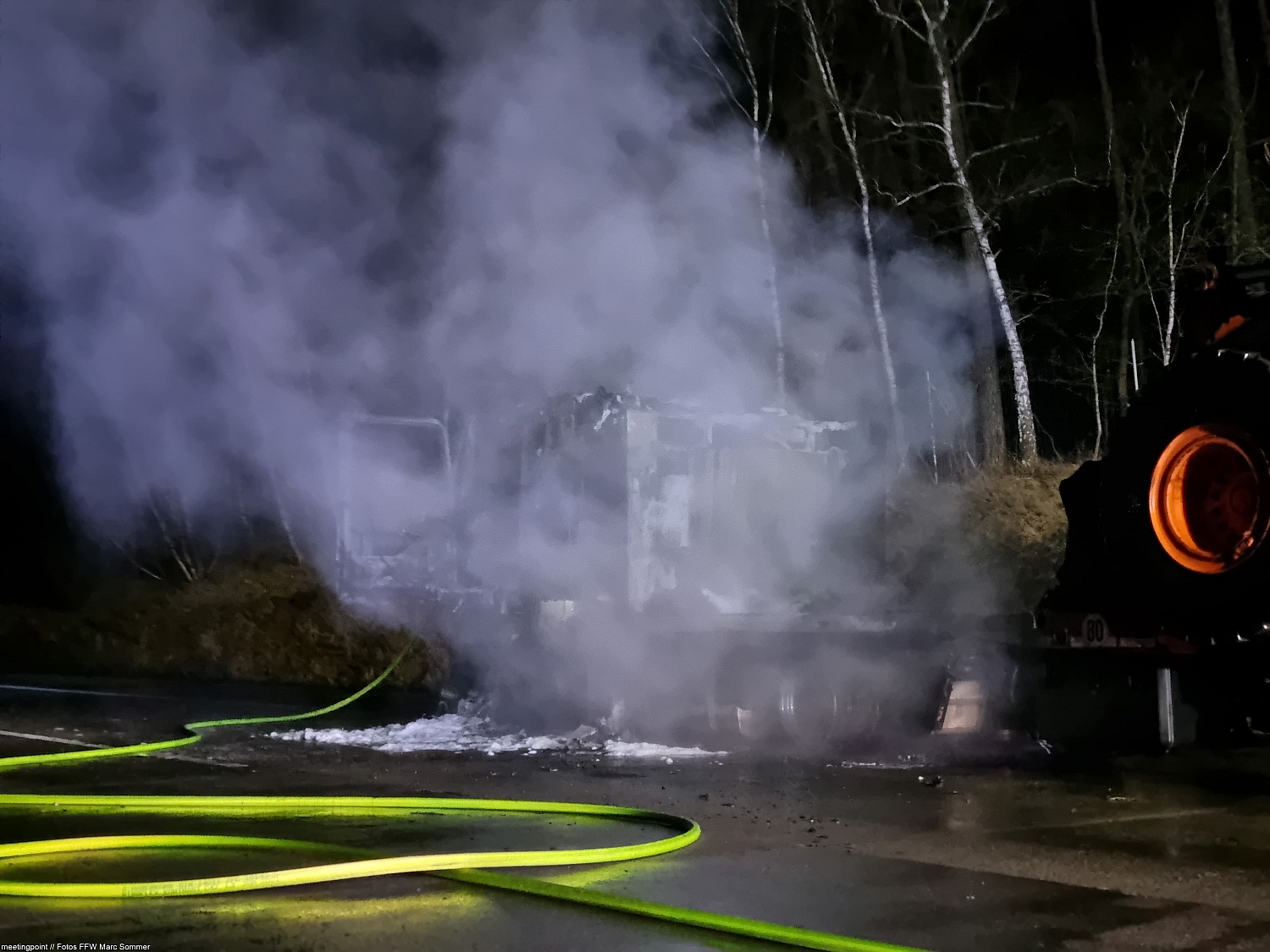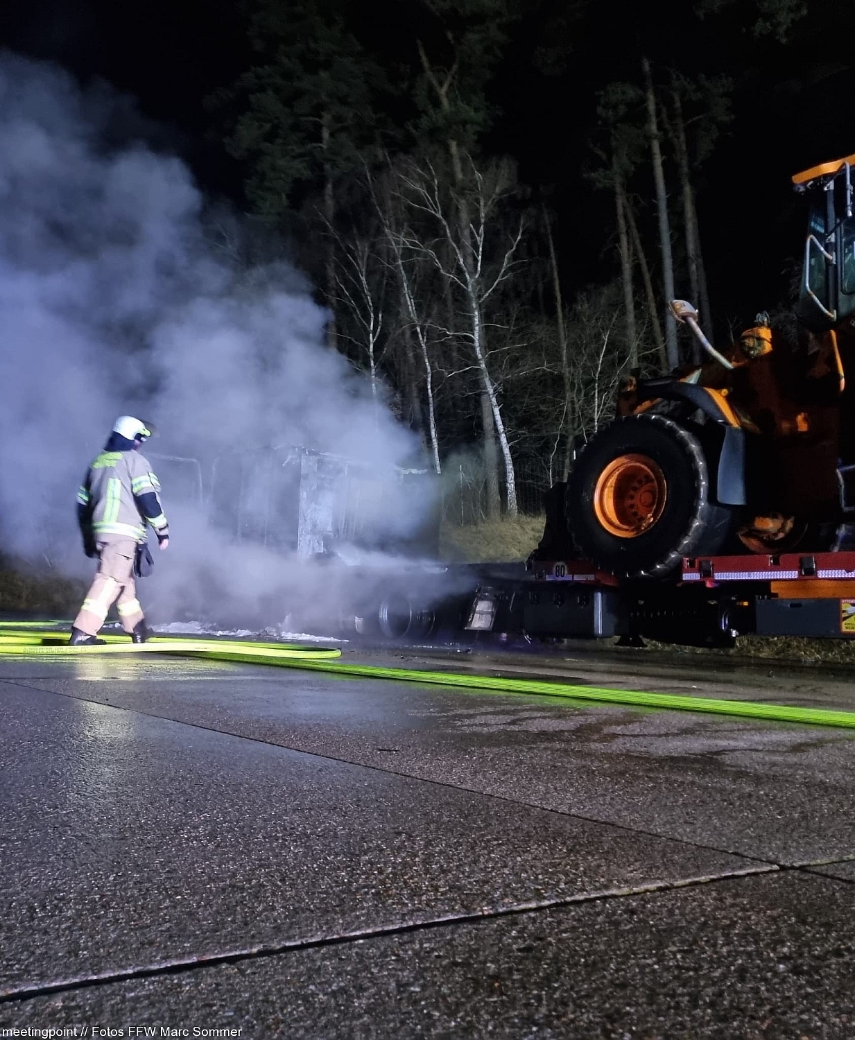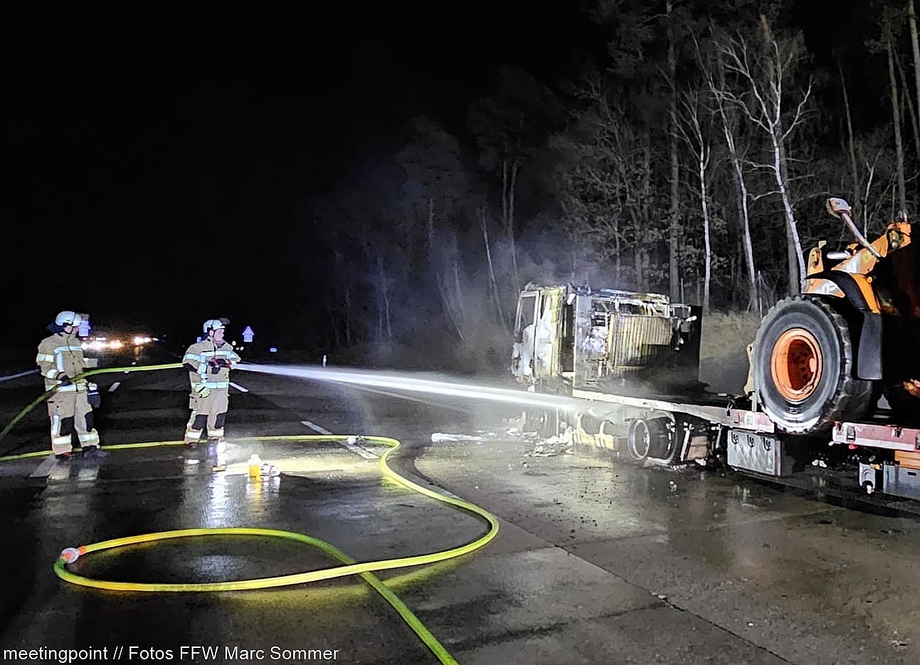 „Wir führten sofort einen Löschangriff durch, um die Ladung vor Beschädigungen zu schützen“, erläuterte Einsatzsprecher Marc Sommer. Während ein Trupp sich auf den Schutz des Traktors konzentrierte, kämpfte ein zweiter Trupp gegen die Flammen der Zugmaschine. Die Taktik zeigte schnell Erfolg: Das Feuer konnte zügig unter Kontrolle gebracht und gelöscht werden. Nach den anschließenden Kontroll- und Nachlöscharbeiten konnten die Kameraden nach gut zwei Stunden den Einsatz beenden.