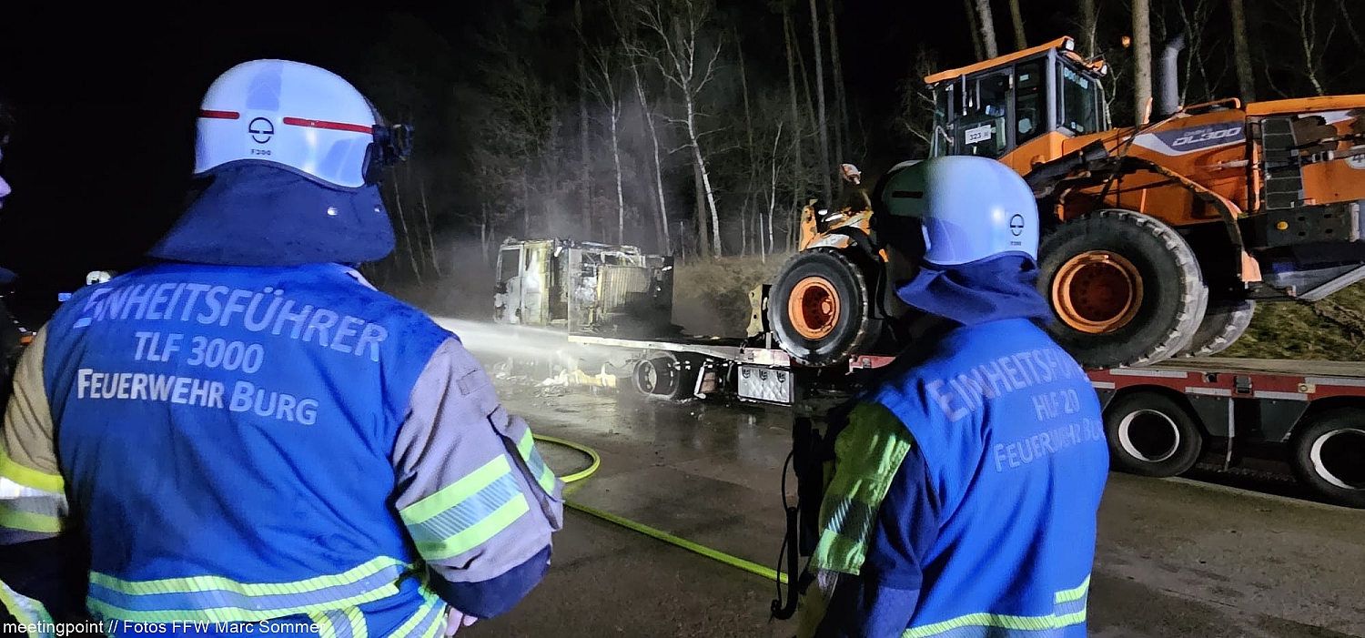 Die alarmierten Freiwilligen Feuerwehren aus Burg, Niegripp und Möser trafen kurz nach der Alarmierung um 02:03 Uhr am Einsatzort ein. Für die Einsatzkräfte bot sich ein klares Bild: Während die Zugmaschine bereits vollständig in Flammen stand, war die wertvolle Ladung – ein Traktor – noch unbeschädigt.