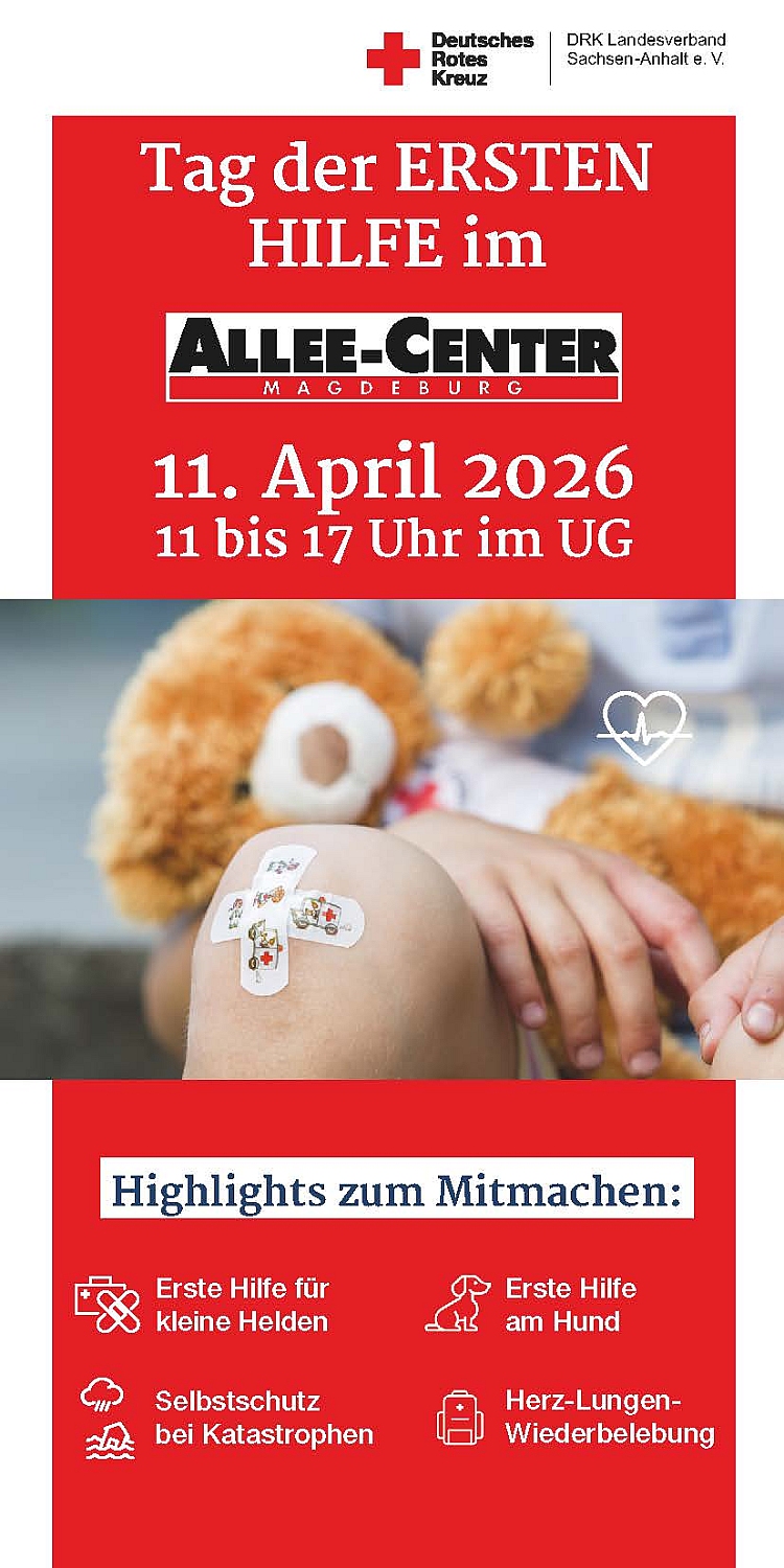 Für 40 % der Deutschen liegt der letzte Erste-Hilfe-Kurs mehr als 15 Jahre zurück, und nur etwas mehr als ein Drittel leistet im Notfall Wiederbelebung. Um dies zu ändern, lädt das DRK Sachsen-Anhalt zum Erste-Hilfe-Tag am 11. April 2026 ins Untergeschoss des Allee Centers in Magdeburg ein.